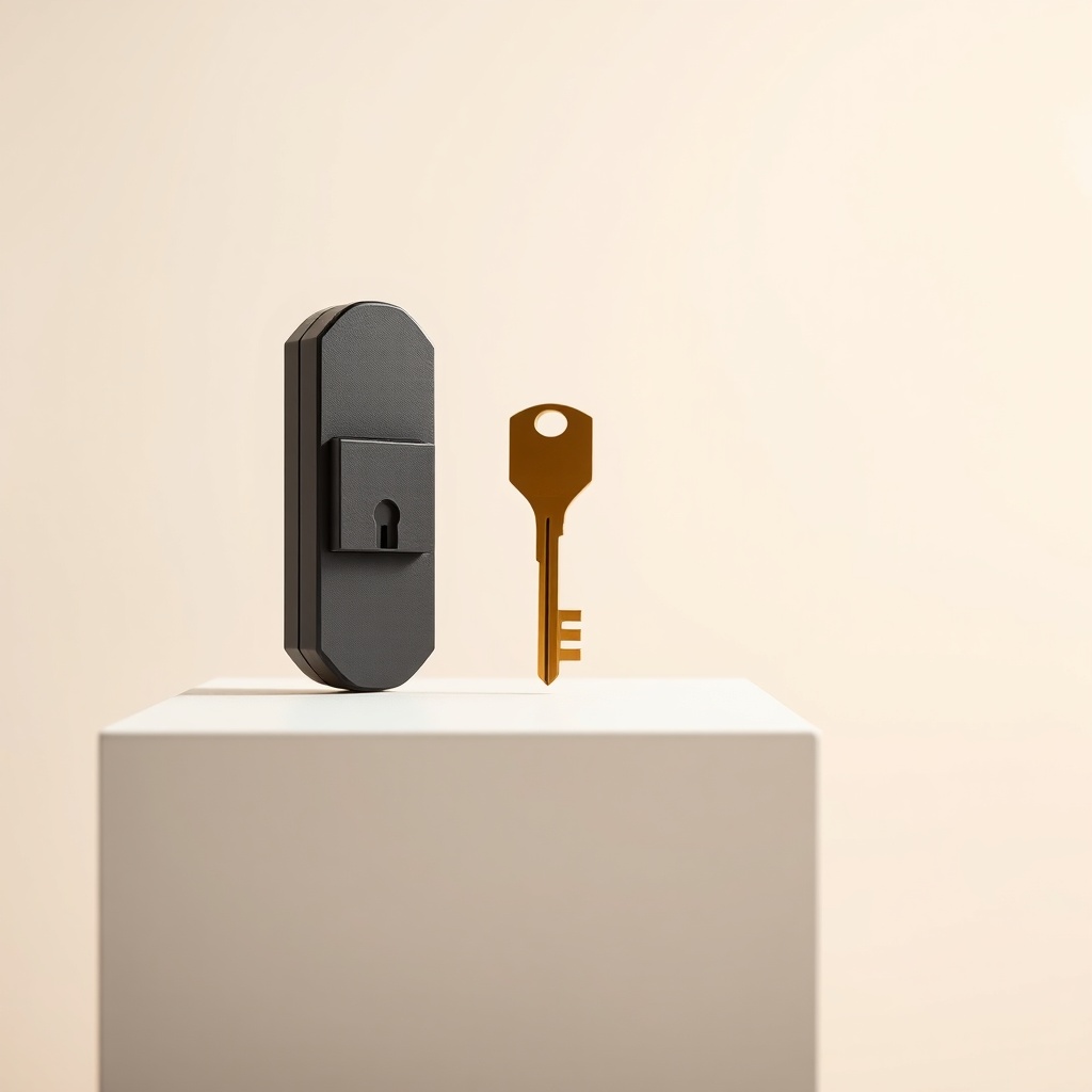 Cerradura euro y llave moderna sobre un plinto blanco, resaltando opciones confiables para cambiar cerraduras en Mataró.