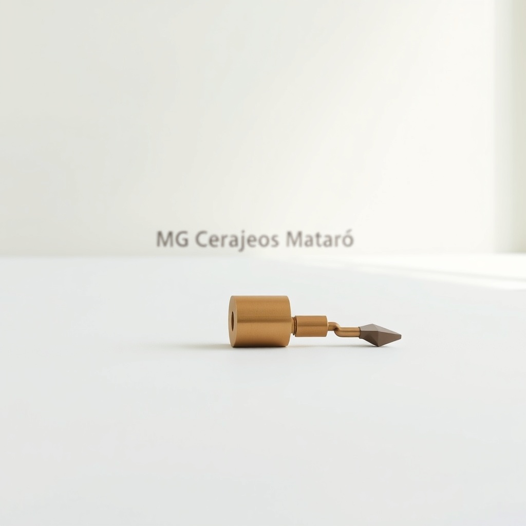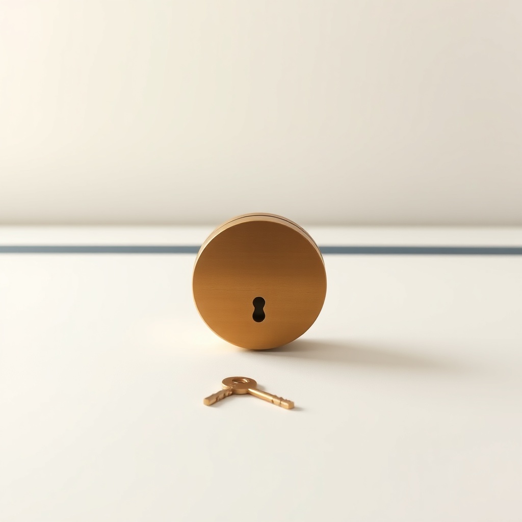 Un cilindro de cerradura de latón y una llave minimalista flotan sobre un fondo blanco, evocando servicios de cerrajería en Mataró.