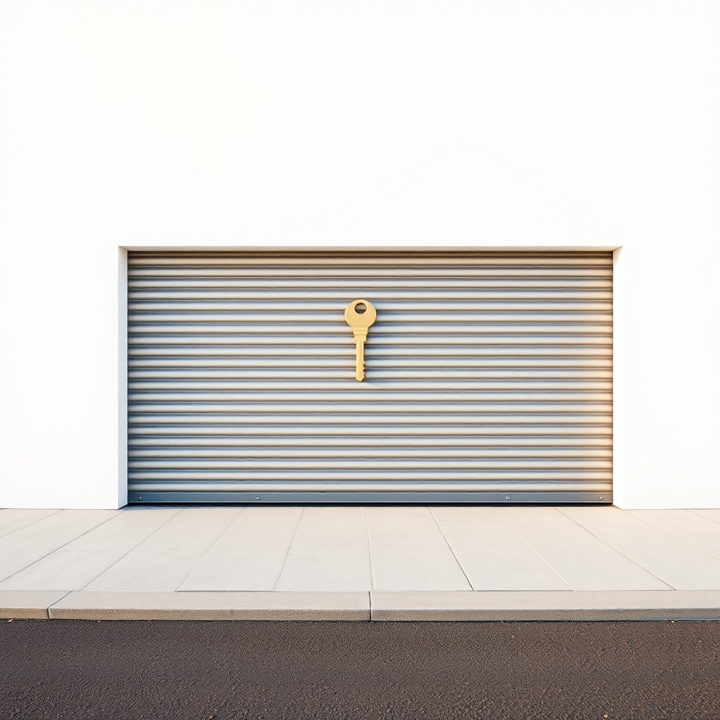 Panel de garaje de acero mate con llave de bronce, fondo blanco y cielo claro; ideal para encontrar un cerrajero de confianza para reparación de garajes en Mataró.