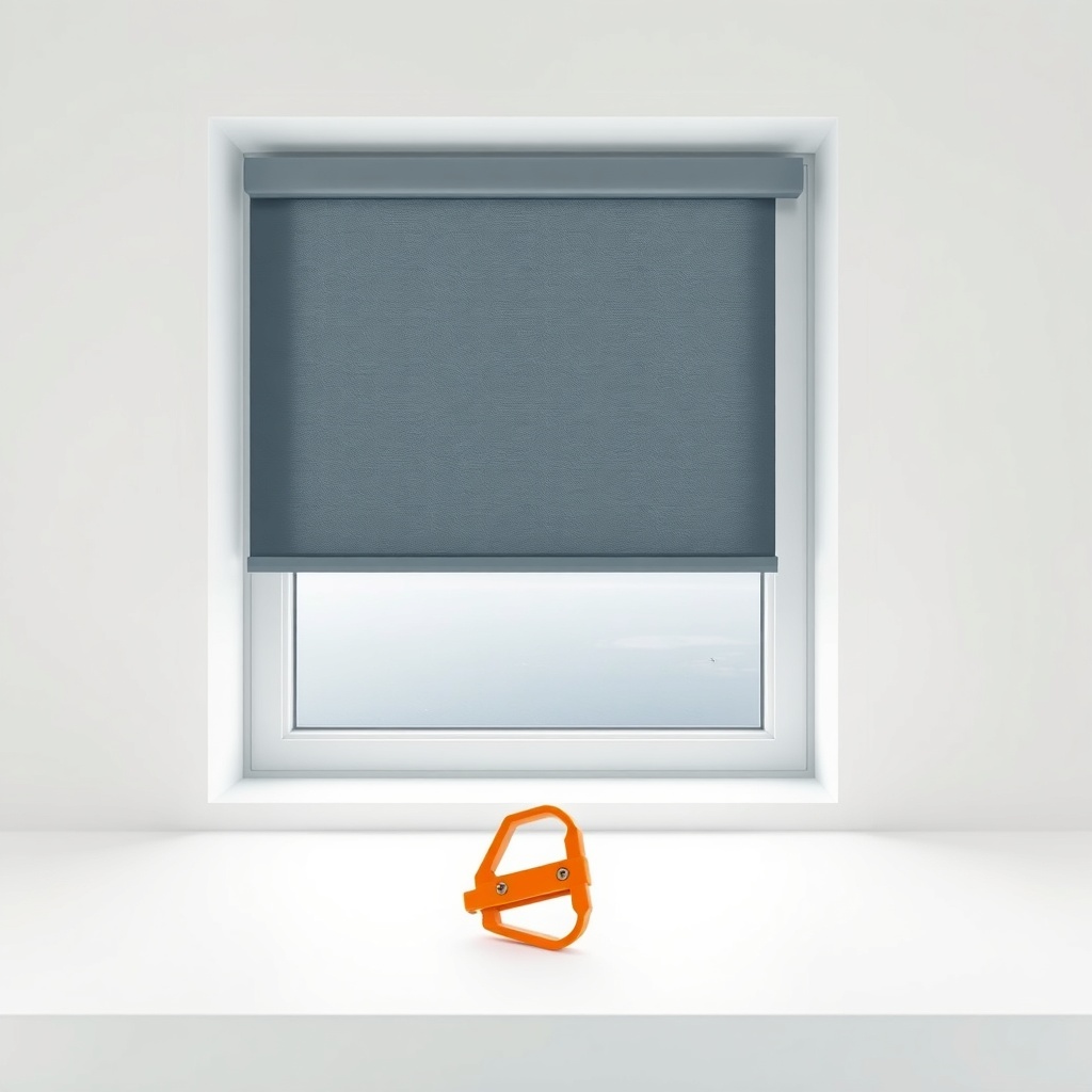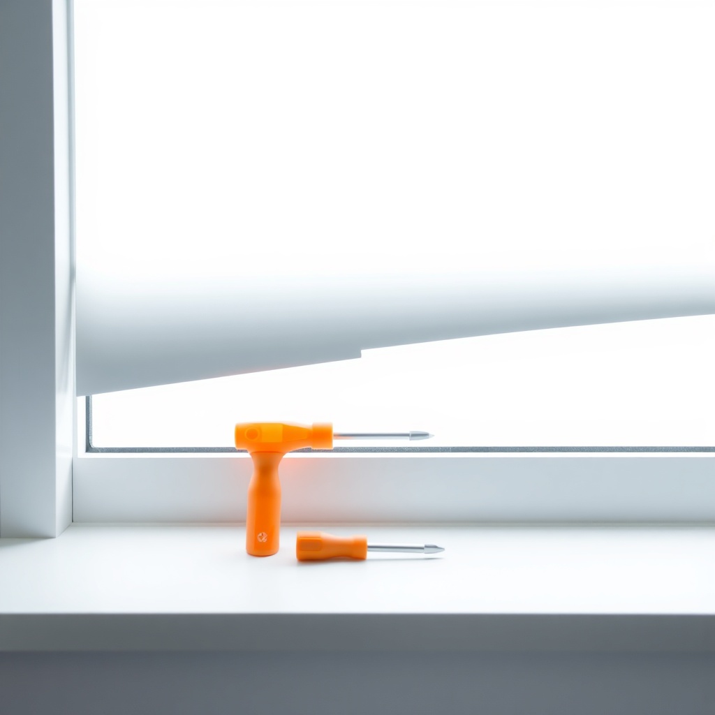 Ventana minimalista de estilo Bauhaus con persiana, herramienta naranja y horizonte mediterráneo; urgencia en el aire. Donde contratar un servicio urgente de reparacion de persianas en Premia de Mar.