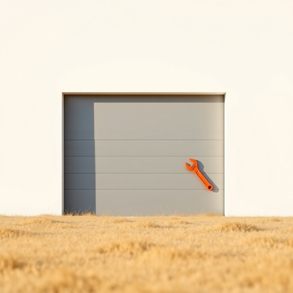 Puerta de garaje geométrica entreabierta sobre fondo blanco, con un icono de llave inglesa; opciones para reparar puertas de garaje en Mataró.